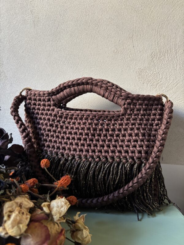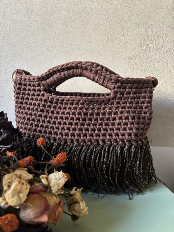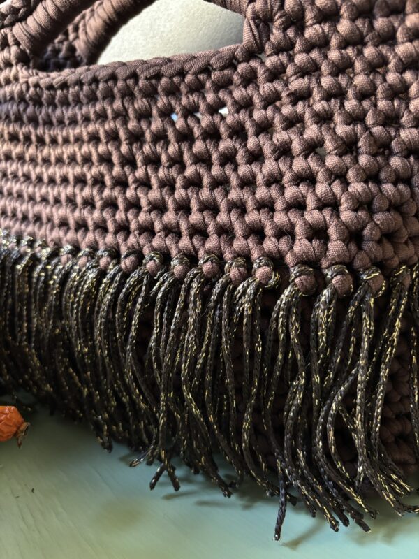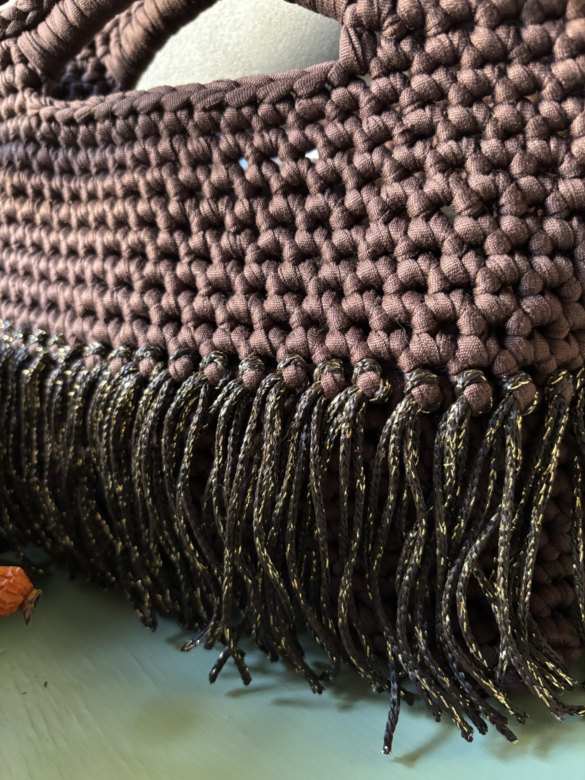 Borsa realizzata a mano in fettuccia morbida color cioccolato. Rifinita sul fondo di frange realizzate con cordino marrone scuro con filamenti in oro.