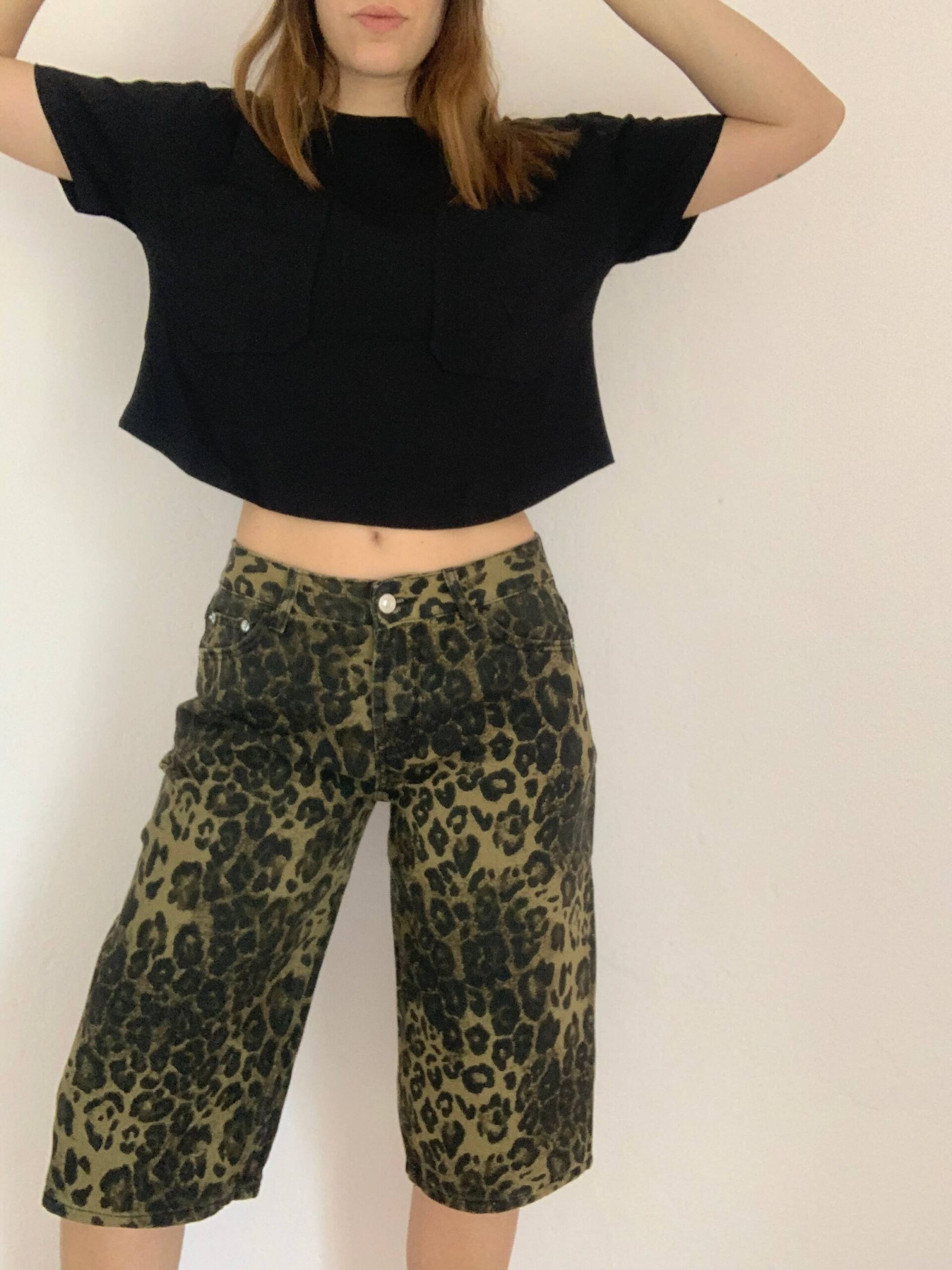 Bermuda jeans leopardato, non elasticizzato, vestibilità ridotta.