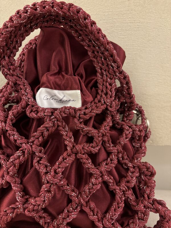 Borsa realizzata a mano in cordino bordeaux con filamenti in oro.