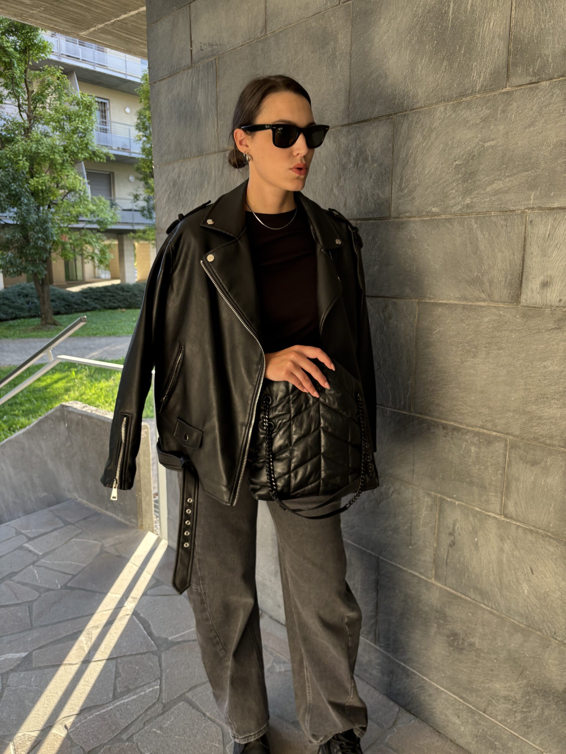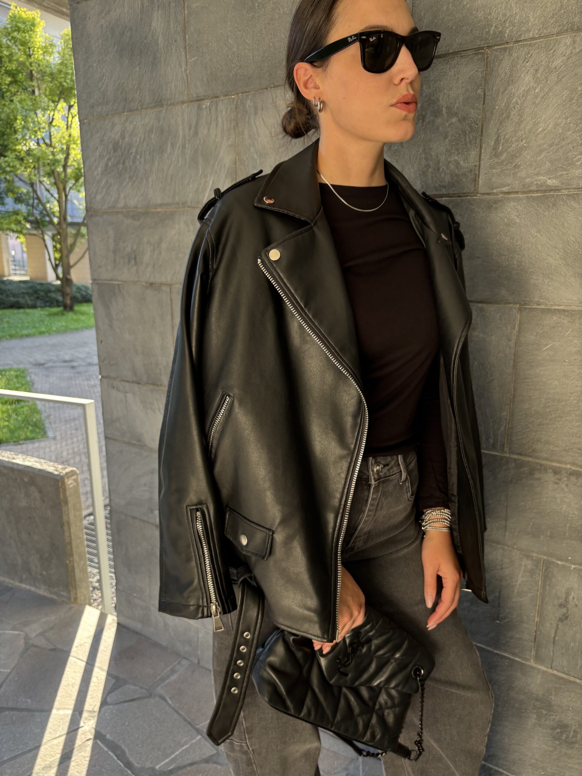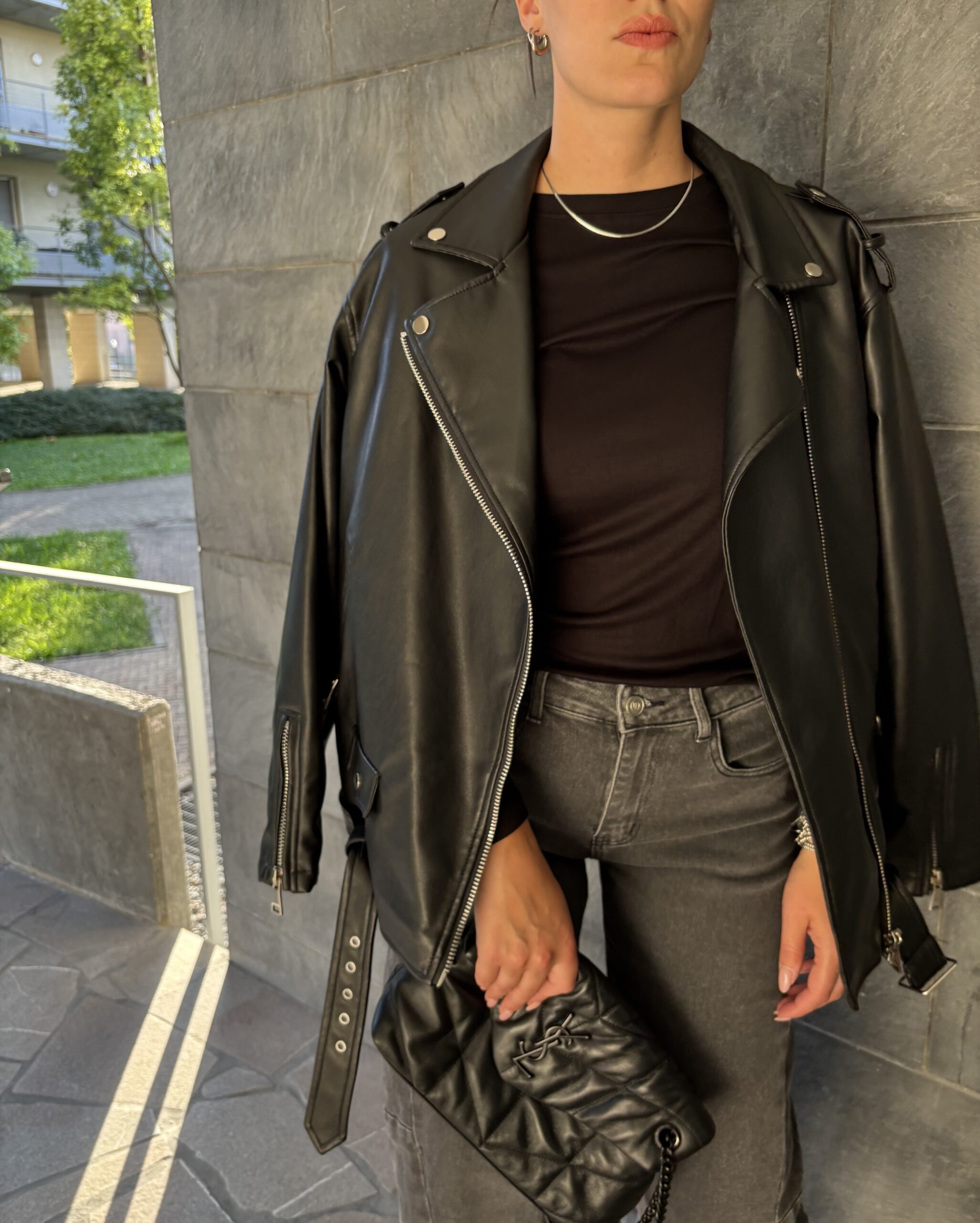 Chiodo ecopelle nero, vestibilità oversize, taglia unica.
