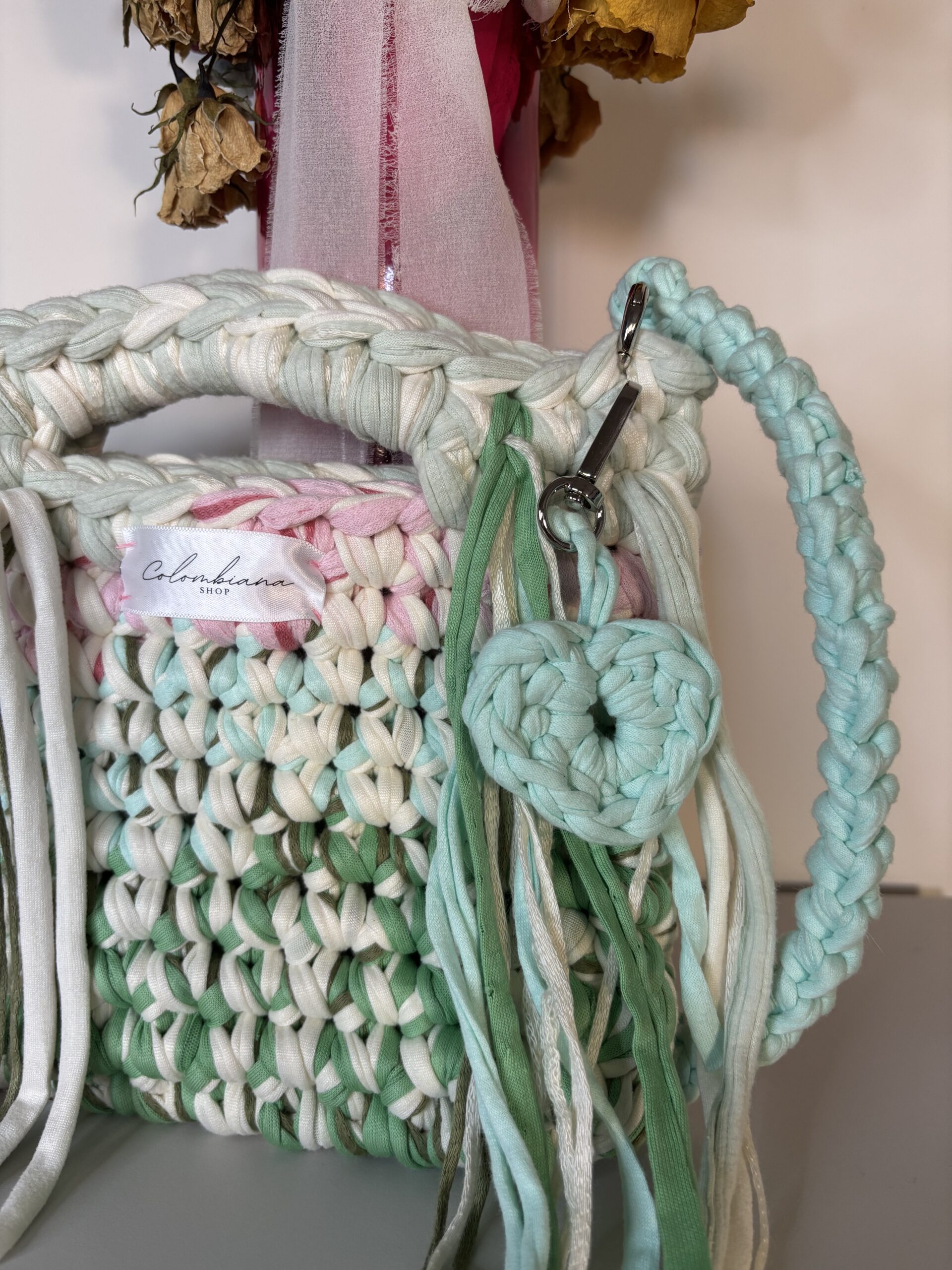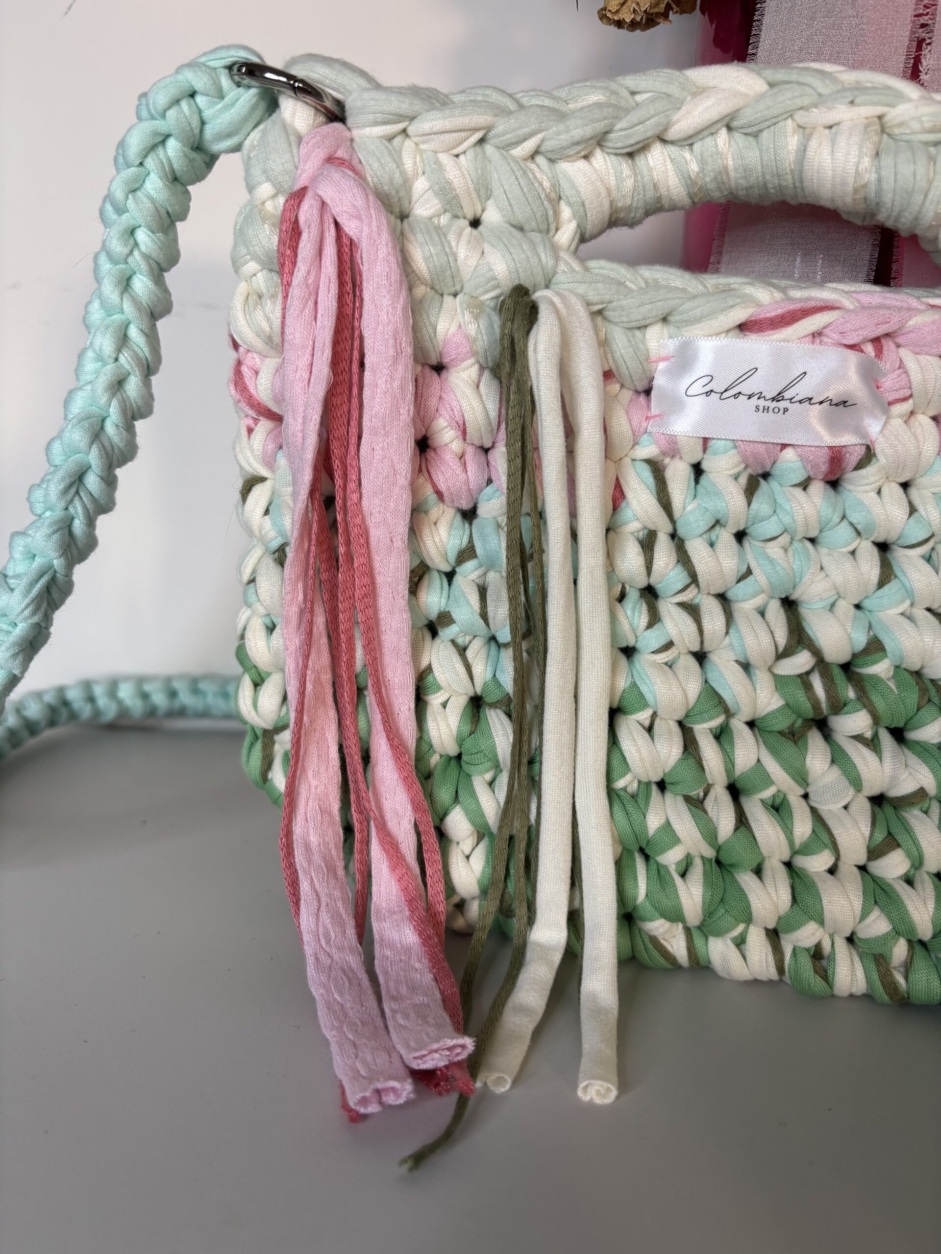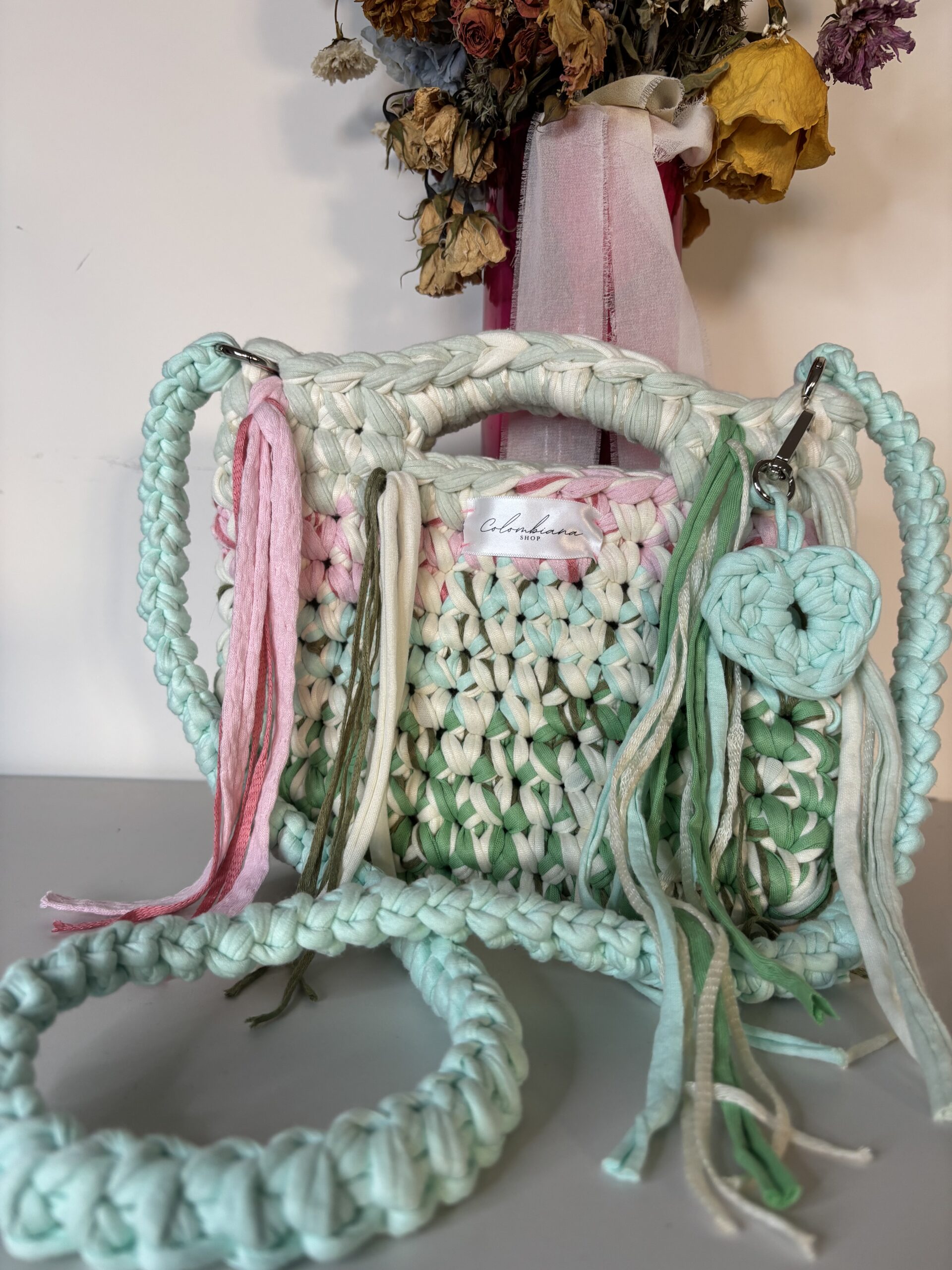 Borsa realizzata a mano con fettuccia semi morbida. La borsa è realizzata con fettuccia verde, azzurra, rosa e bianca. Completa di tracolla removibile e maniglia incorporata per essere portata anche a mano. Impreziosisce la borsa un charms azzurro removibile.