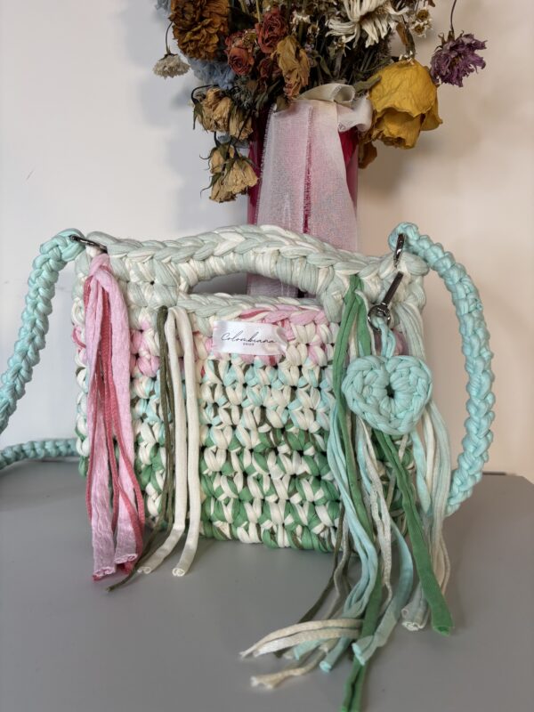 Borsa realizzata a mano con fettuccia semi morbida. La borsa è realizzata con fettuccia verde, azzurra, rosa e bianca. Completa di tracolla removibile e maniglia incorporata per essere portata anche a mano. Impreziosisce la borsa un charms azzurro removibile.