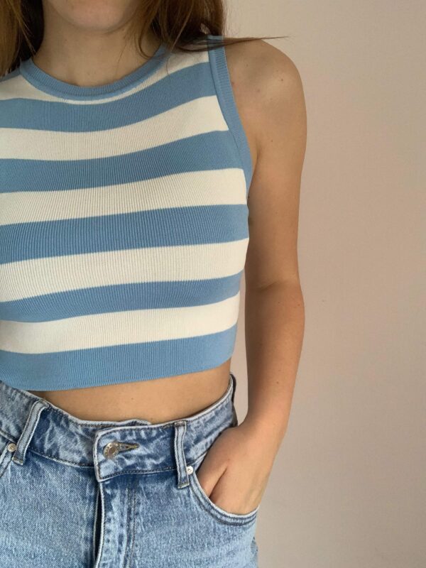 Toppettino elasticizzato modello crop. Taglia unica, due varianti colori: bianco e azzurro – fucsia e bianco.